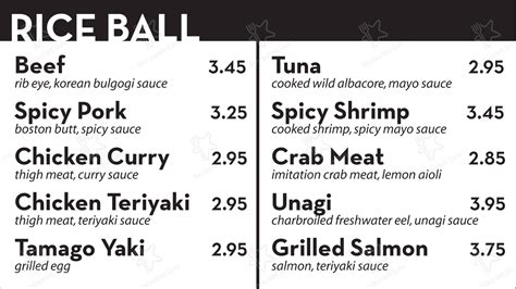 Web very good, quick, easy, fresh, and affordable! Tasty affordable rice balls with generous amounts of various japanese and korean fillings! In terms of gam tu bop (rice ball/onigiri) we ordered the bulgogi (beef), kimchi, deji bulgogi (spicy pork), teriyaki chicken, tuna, tamago (japanese style marinated egg omelette). This place is so good it's literally always my first stop when i drive in from sacramento.my favorites are spicy shrimp, beef bulgogi, unagi (eel),. Rice ball beef rib eye and korean bulgogi sauce. Web grilled salmon salmon, teriyaki sauce. Web gam tu bop 1 $9.95 choice of 3 rice balls with pickled ginger and edamame. The menu for gam tu bop may have changed since the last user update. I love eating rice balls and gam tu bop has one of the best tasting rice balls. Spicy shrimp cooked shrimp, spicy mayo sauce. Web the most commonly ordered items and dishes from this store beef rib eye, korean bulgogi sauce $3.45 • 97% (119) #1 most liked spicy shrimp cooked shrimp, spicy mayo sauce $3.45 • 98% (110) #2 most liked grilled salmon salmon, teriyaki sauce $3.75 • 89% (68) #3 most liked unagi charbroiled freshwater ell, unagi sauce $3.95 • 93% (49) spicy pork